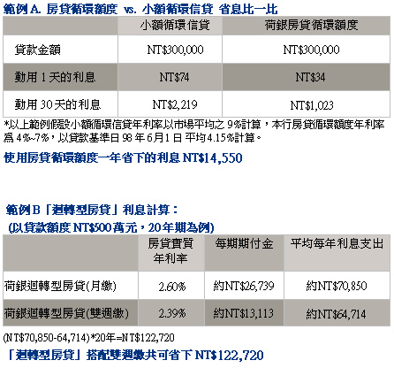 荷銀「迴轉型房貸」將您所償還的每一塊錢本金,都回饋成您的循環額度(註1),成為一筆備用金。您所還本金愈多,回復的備用金額度愈高!讓您在急用時省去新貸的繁雜申請手續。循環額度利率低於一般個人信貸、信用卡循環額度、現金卡循環額度,可以為您省下更多利息(見範例A)。